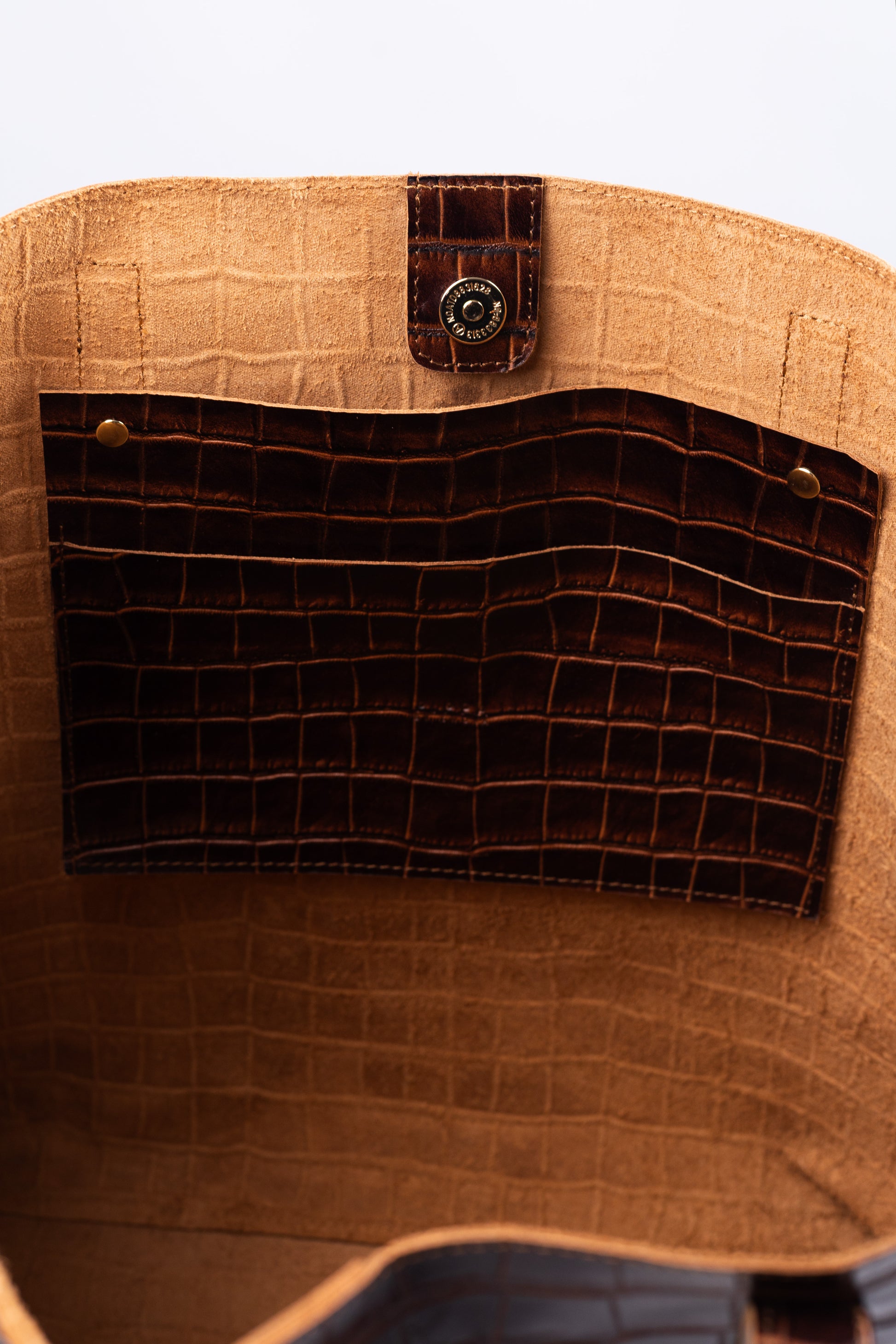 El interior, en acabado natural sin forro, incluye un bolsillo organizador en cuero croco, mientras que las asas firmes garantizan comodidad al llevarla al hombro. Un tote imponente, funcional y con carácter propio para acompañarte en trayectos largos y días intensos.