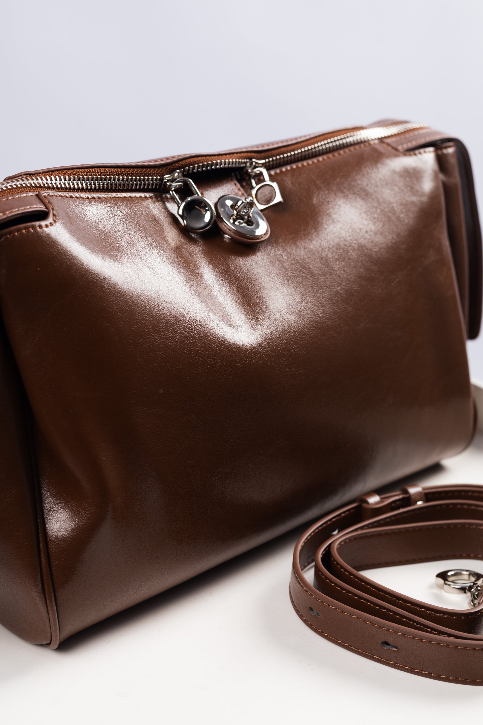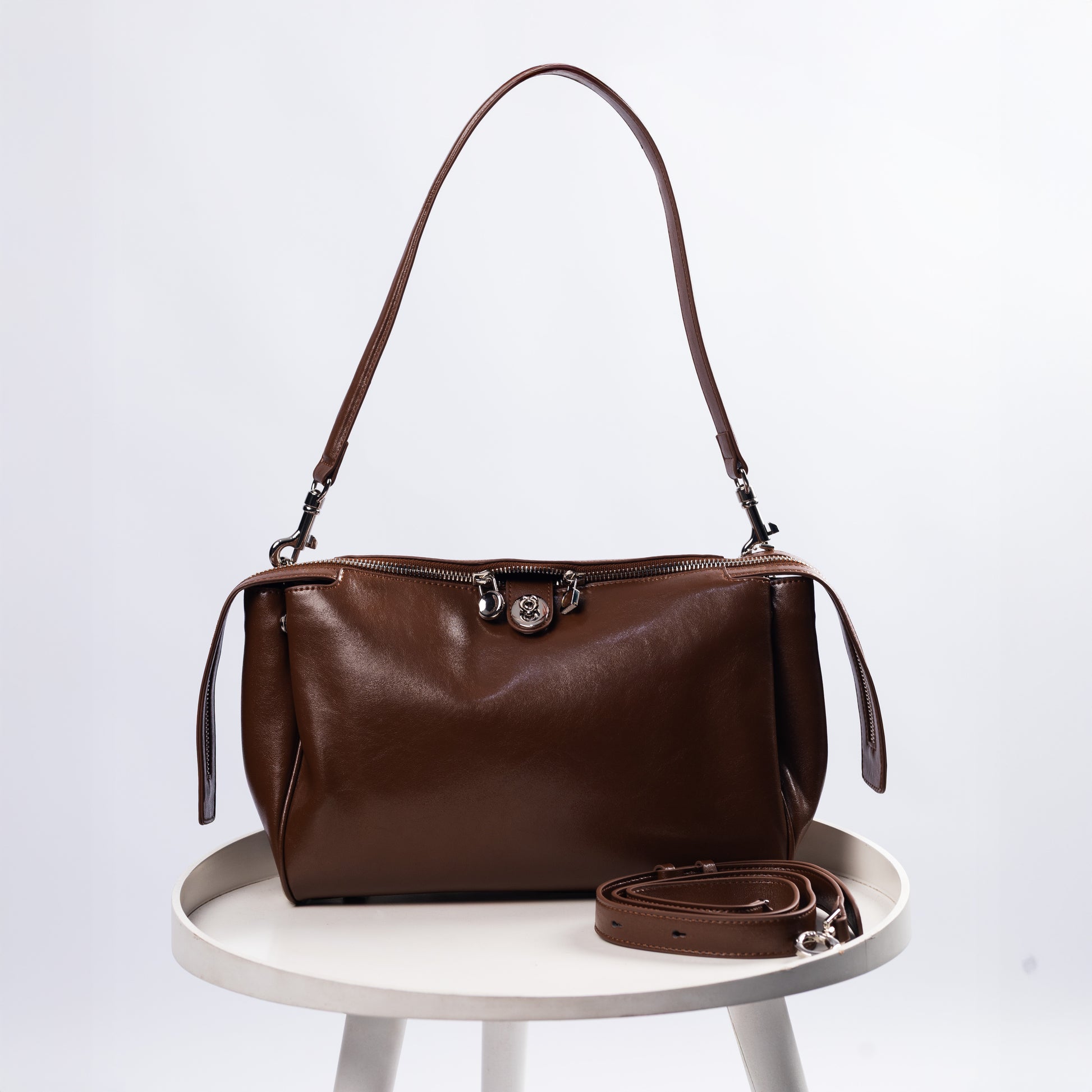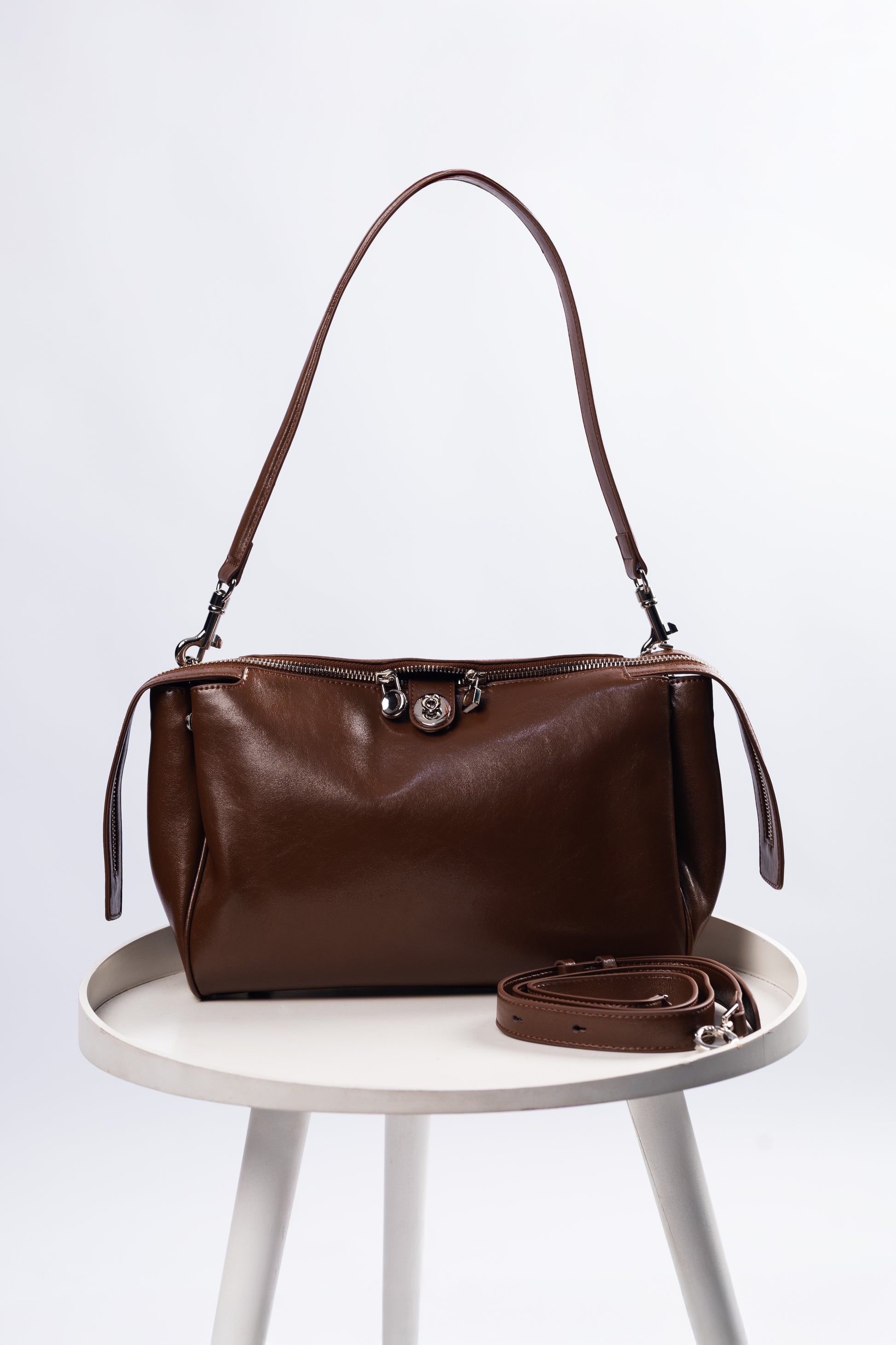 El modelo Nemi Café está elaborado en cuero liso con una textura suave que aporta un acabado elegante y atemporal; cuenta con cierre superior metálico y un broche frontal decorativo que añade un detalle distintivo. Su interior forrado ofrece una distribución práctica: compartimento central con cierre, un bolsillo interno con cierre, un bolsillo abierto y espacio suficiente para llevar tus esenciales con comodidad. Incluye asa al hombro y correa larga removible para usarla cruzada, convirtiéndola en una pieza versátil, funcional y perfecta para el día a día.